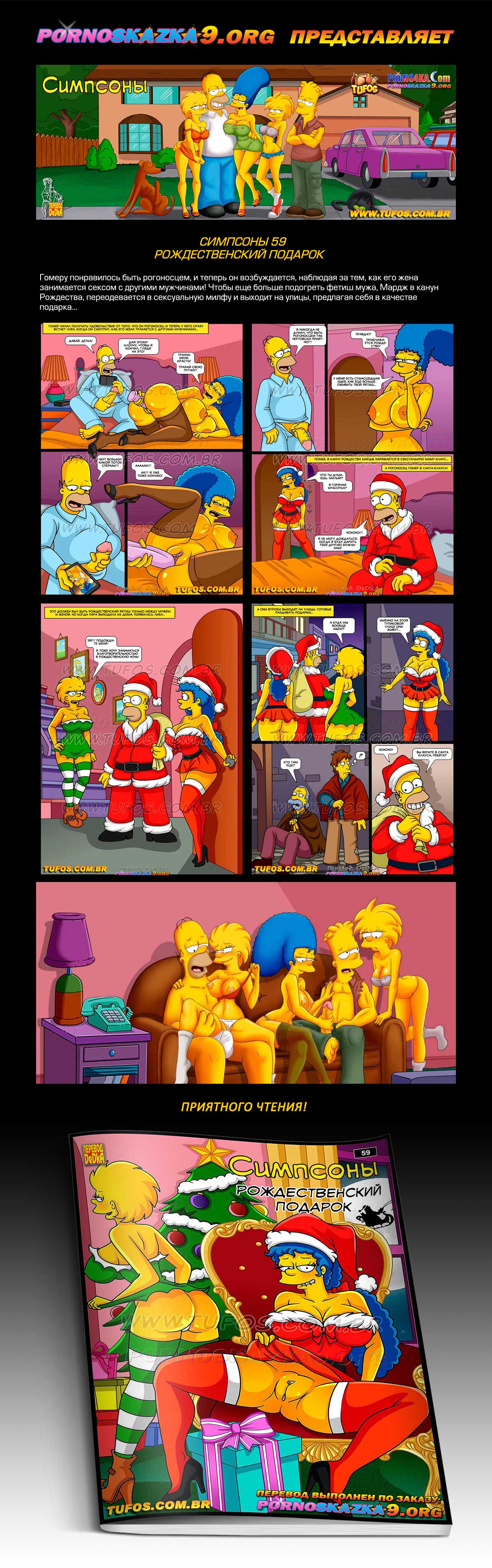 Порно комикс «Симпсоны. Часть 59. Рождественский подарок». Гомеру понравилось быть рогоносцем, и теперь он возбуждается, наблюдая за тем, как его жена занимается сексом с другими мужчинами! Чтобы еще больше подогреть фетиш мужа, Мардж в канун Рождества, переодевается в сексуальную милфу и выходит на улицы, предлагая себя в качестве подарка…